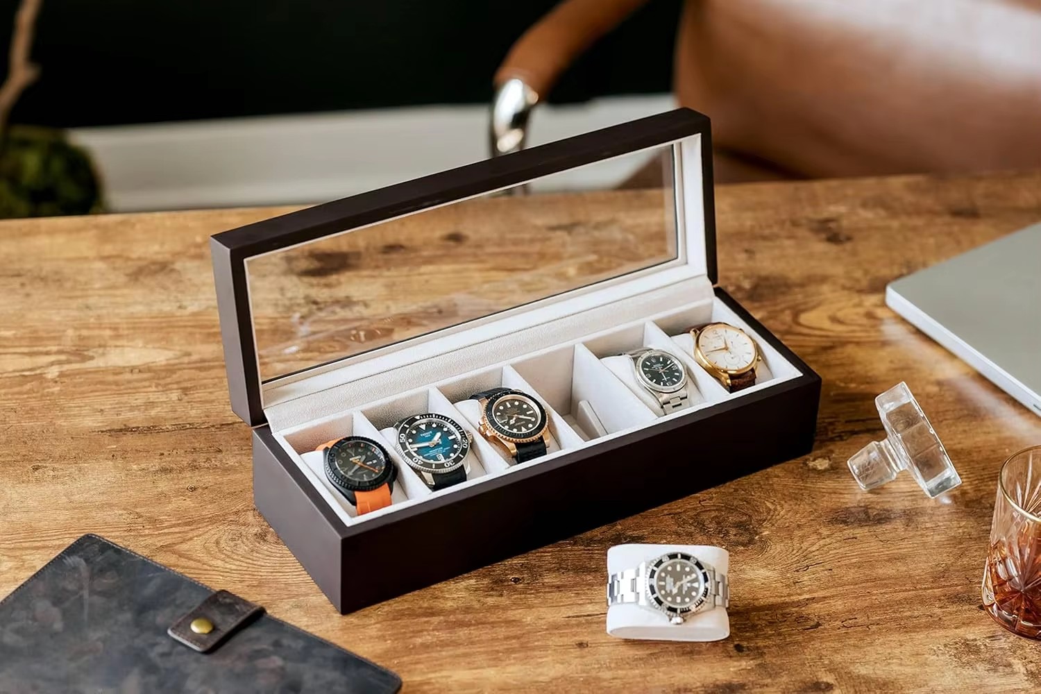 Give your watches a home they deserve with this SOLID, SLEEK watch box. Our refreshing design carefully incorporates deep ridges, straight lines, and a REAL GLASS display.