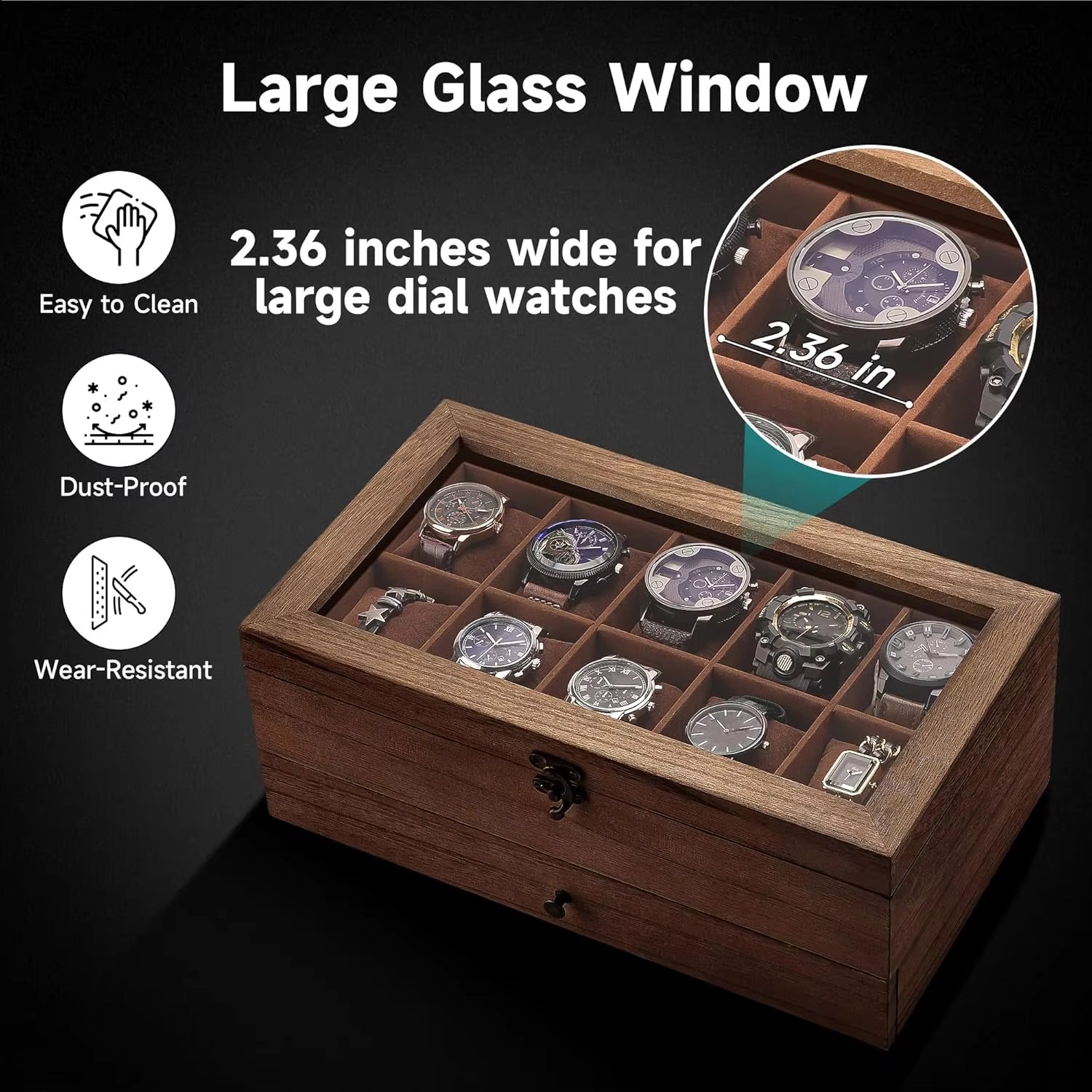 Transparent glass cover: A sturdy glass window showcases your watch collection, protecting it from dust and scratches, allowing you to find your favorite one at a glance and saving time.