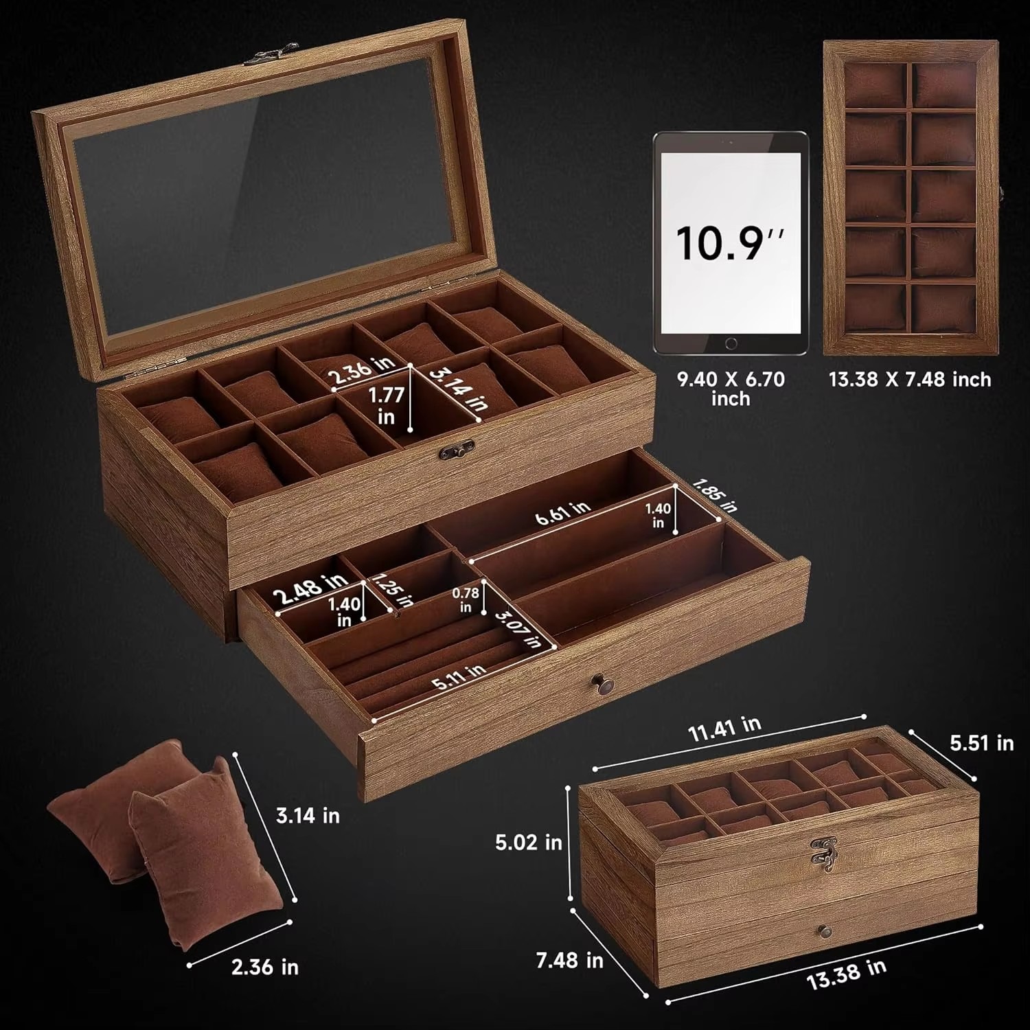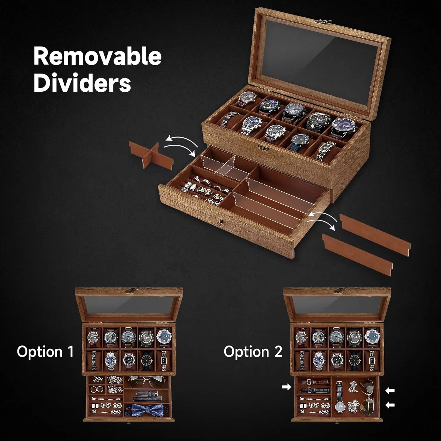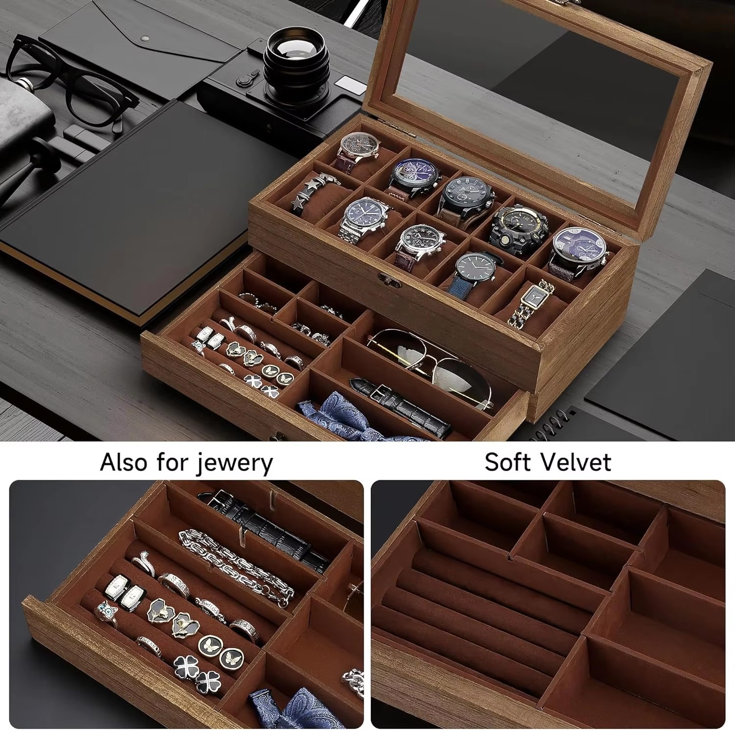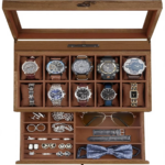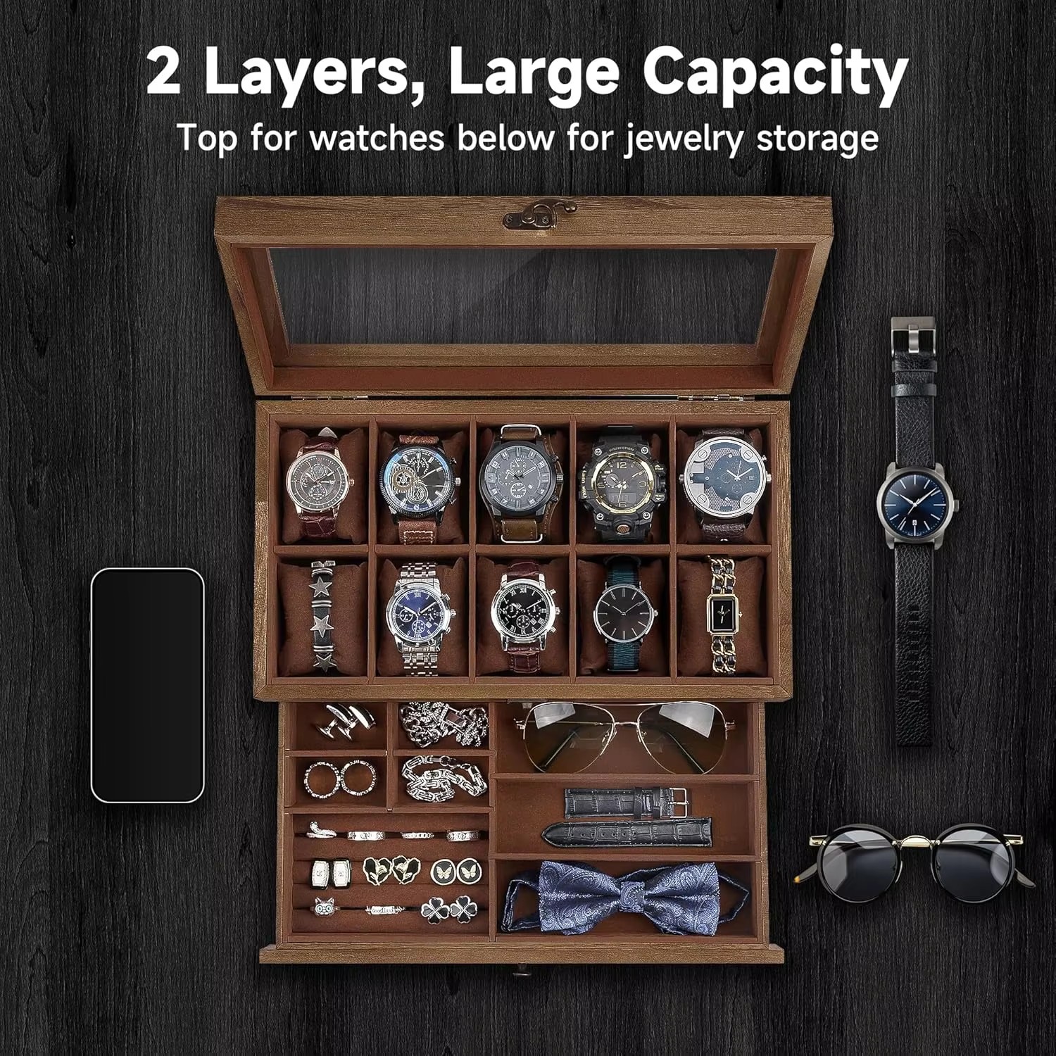 Double-layer design: The upper layer can hold 12 watches, and the lower drawer can additionally store watch straps, cufflinks, bracelets, rings, pens, necklaces and other jewelry, organizing them and preventing them from getting damp, shaking, rubbing or getting lost.