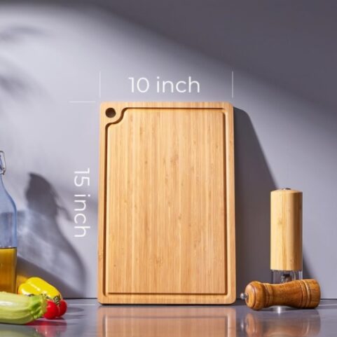 Material: BambooColor: NaturalSpecial Feature: ReversibleRecommended Uses: KitchenDimensions: ‎15″L x 10″W x 0.6″ThCare Instruction: Hand Wash OnlyShape: RectangularItem Weight: 1.04 kg